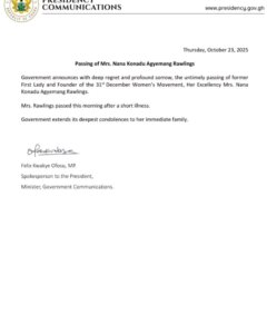 The Presidency of Ghana has issued a somber official announcement confirming the passing of Nana Konadu Agyeman-Rawlings, the nation’s former First Lady and founder of the 31st December Women’s Movement, who died on the morning of October 23, 2025, after a short illness.